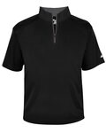 Badger Adult B-Core 1/4 Sleeve Short Sleeve Shirt. 100% Polyester moisture management/antimicrobial performance fabric. Self-fabric collar with 7 locking zipper. Contrast zipper & inner collar. Badger sport shoulder for maximum movement with coverstitch. Double-needle hemmed bottom. Badger heat seal logo on left sleeve